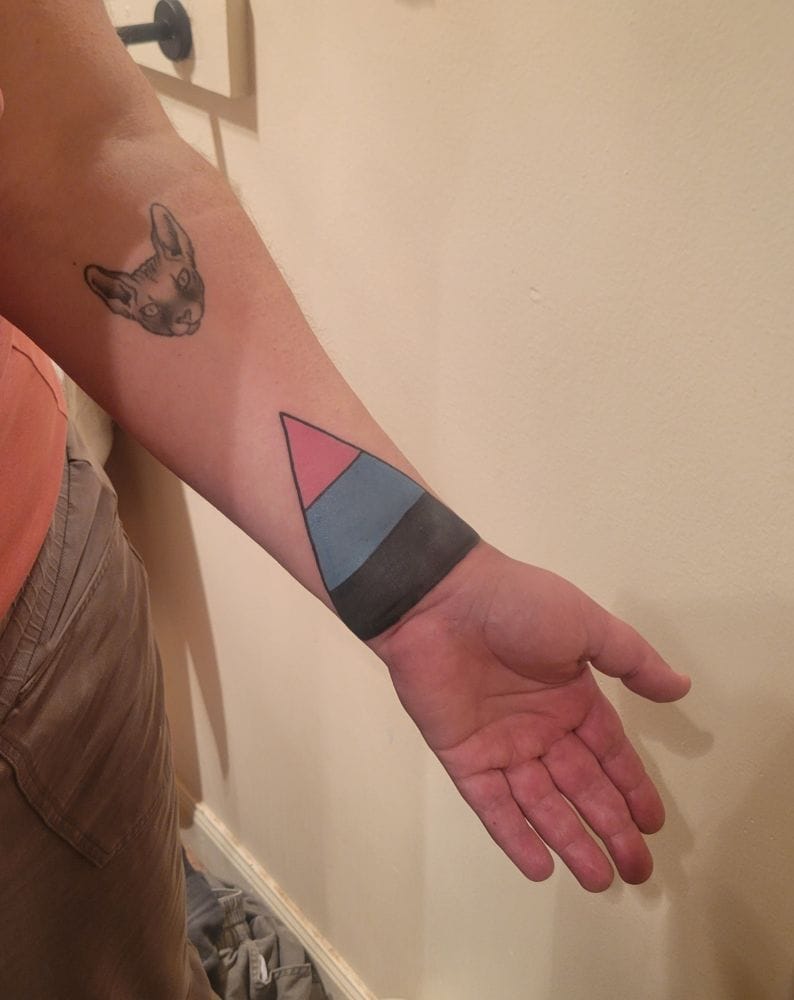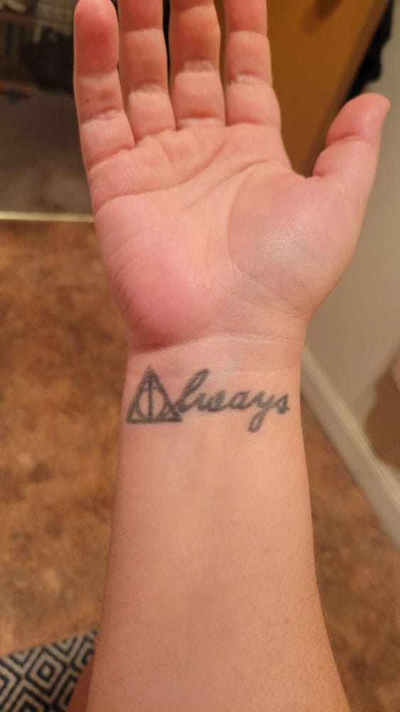 [Image descriptions due to alt text not being built in for galleries: First photo, a light skinned arm showing a wrist tattoo with a Harry Potter themed "Always" design. Second photo, the same tattoo transformed into a triangle filled in with pink, blue, and black stripes.]